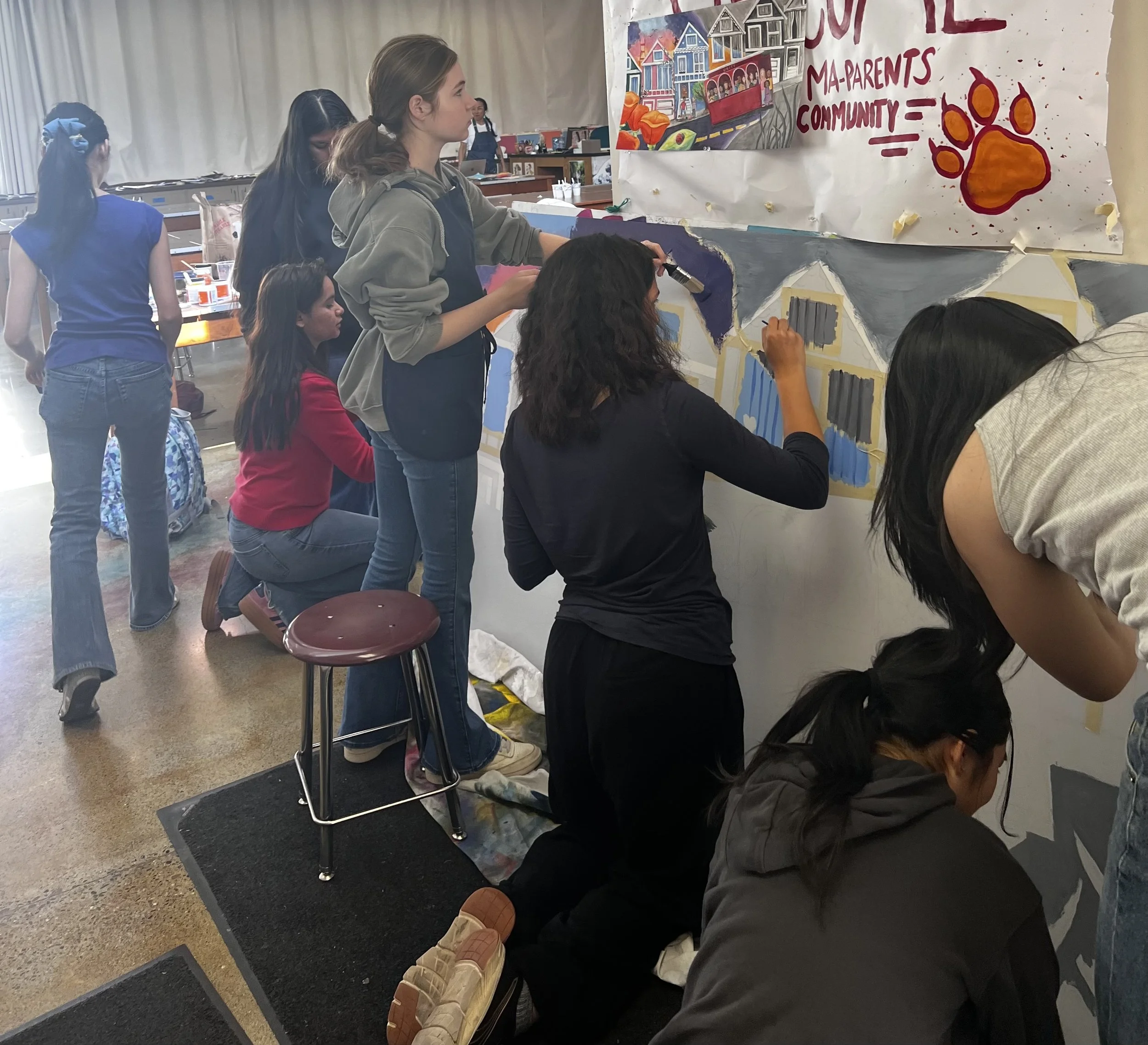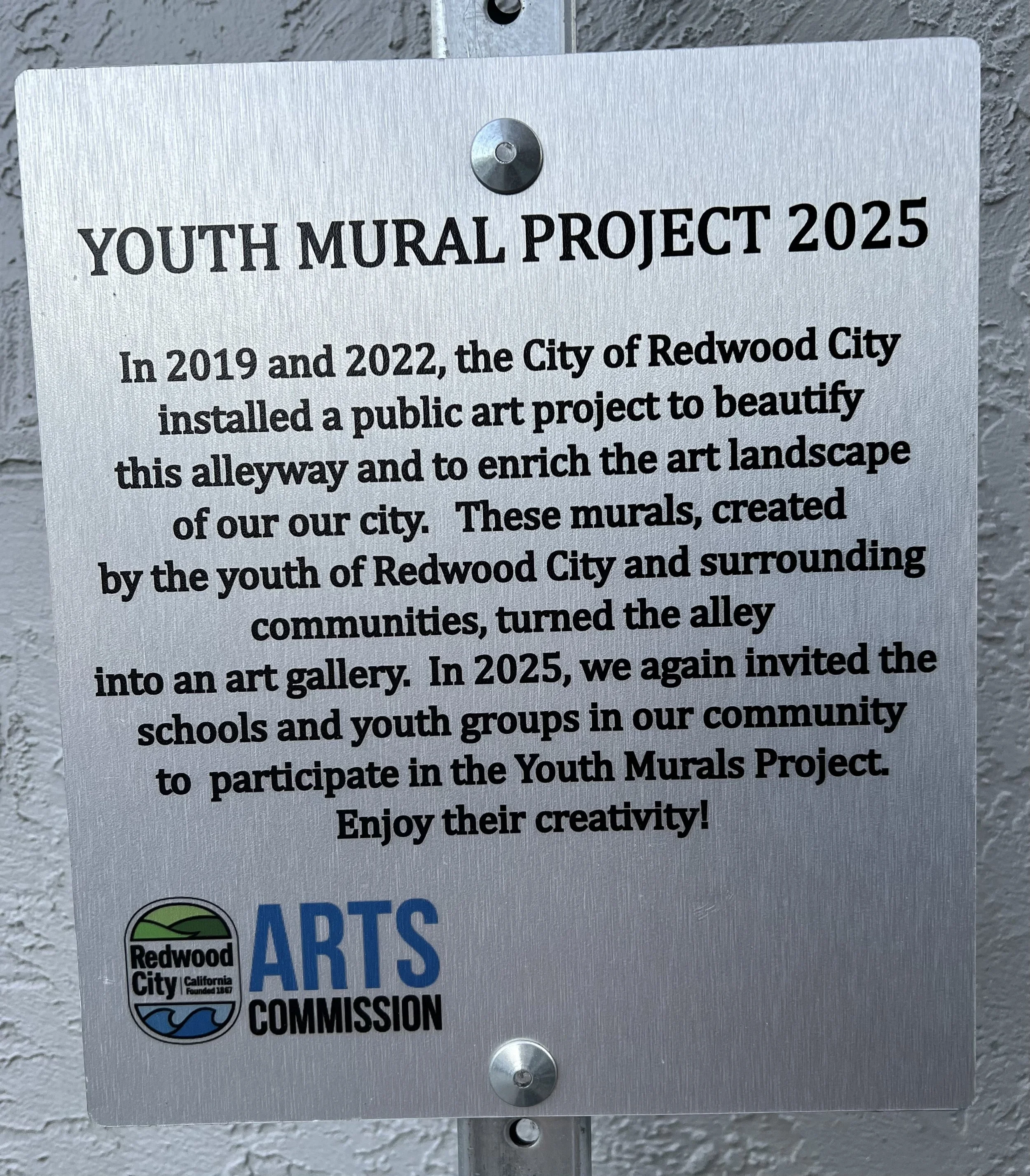 Our project was in collaboration with the Redwood City Arts Commission for the Youth Mural Alley, an arts installation in Redwood City that aims to transform a dark alleyway near the Hotel Sequoia with student art. Our mural simultaneously serves to revitalize a dismal space with its bright imagery while advocating for unity and progress. This project wouldn’t have been possible without the help of the Redwood City Arts Commission and our teacher advisor, Ms. Ulloa! Our mural can be viewed in Redwood City next to the Hotel Sequoia!