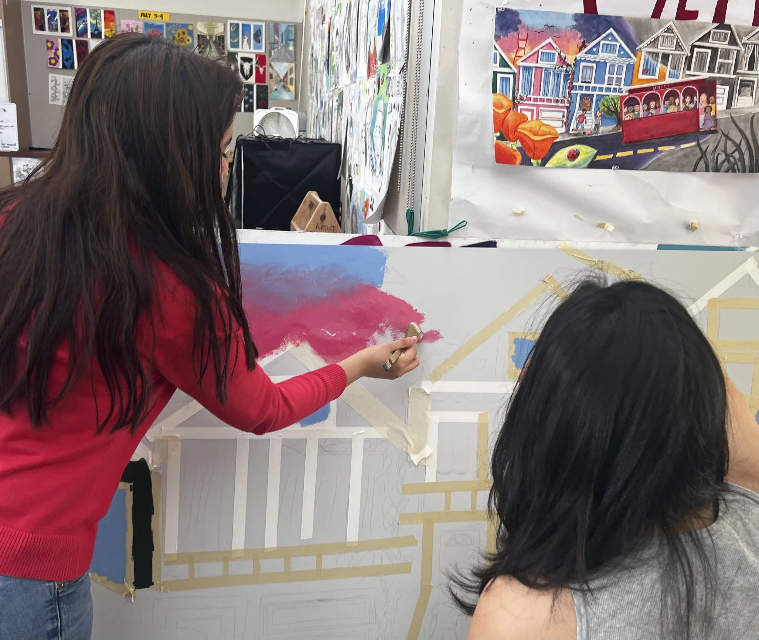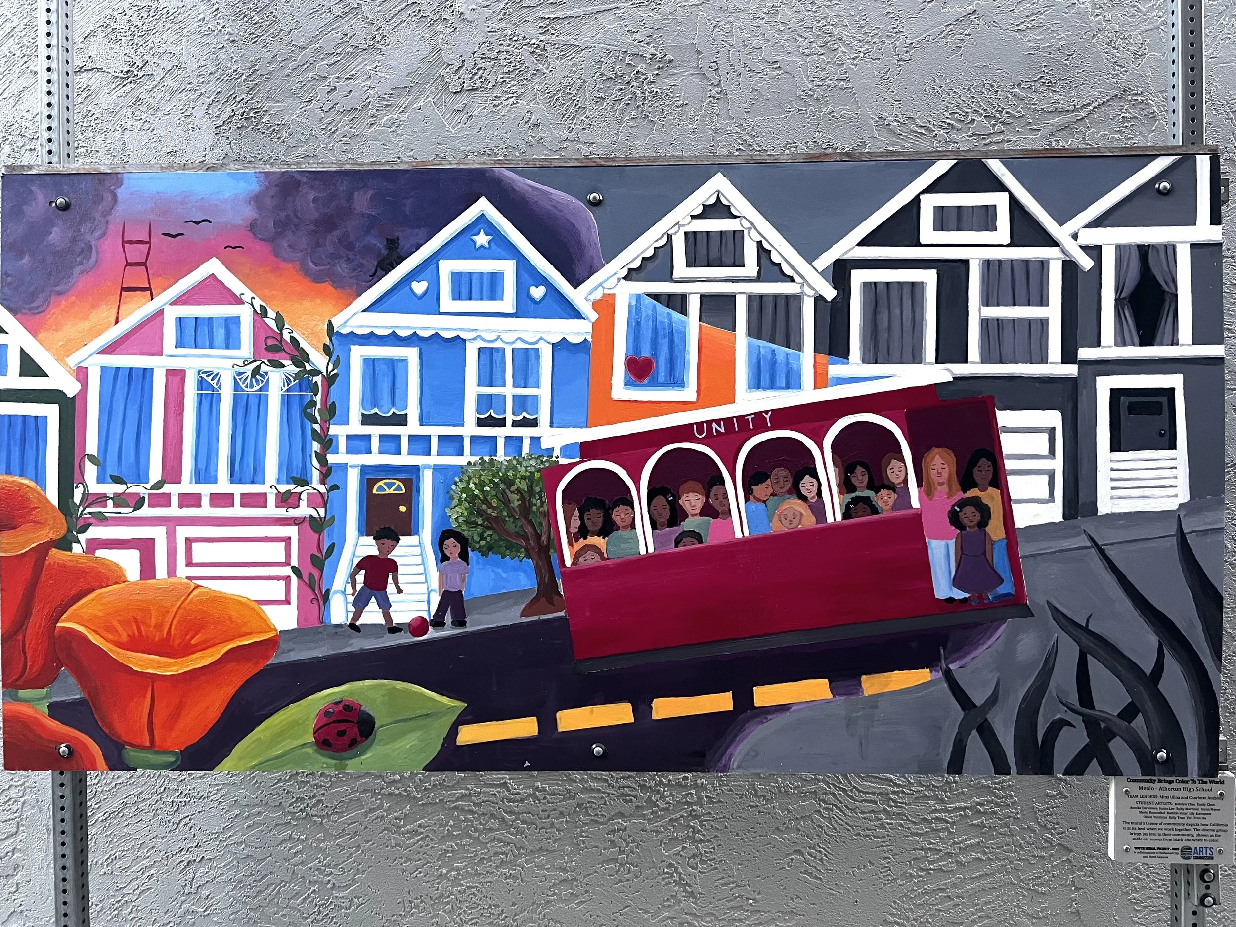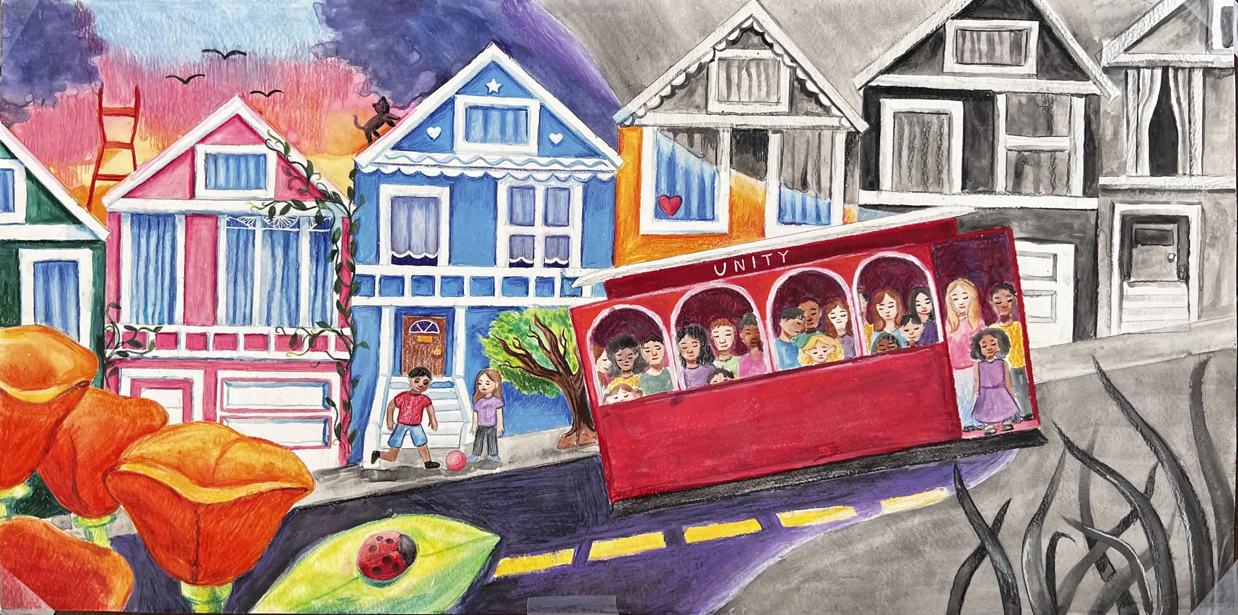 At my high school, I gathered a group of students to propose a unity-themed mural design to the Redwood City Arts Commission for the Youth Mural Alley. During a time of division, our group aimed to create a work of art that embodies how diverse communities can fuel positive change. We spent a month brainstorming, revising, and sketching our idea, which culminated in a mock-up that we presented to the Arts Commission. Our final design incorporated classic symbols of the San Francisco Bay Area such as the Painted Ladies, Sutro Tower, and California poppies into a scene of a diverse community to depict how communities thrive through unity and collaboration.